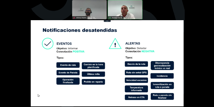 • Alertas. El objetivo es detectar una anomalía y, por tanto, la connotación es negativa. Una alerta requiere de la intervención de un equipo de trabajo (desvío de ruta, ruta sin señal GPS, retraso en ETA, temperatura informada, inmovilización…).